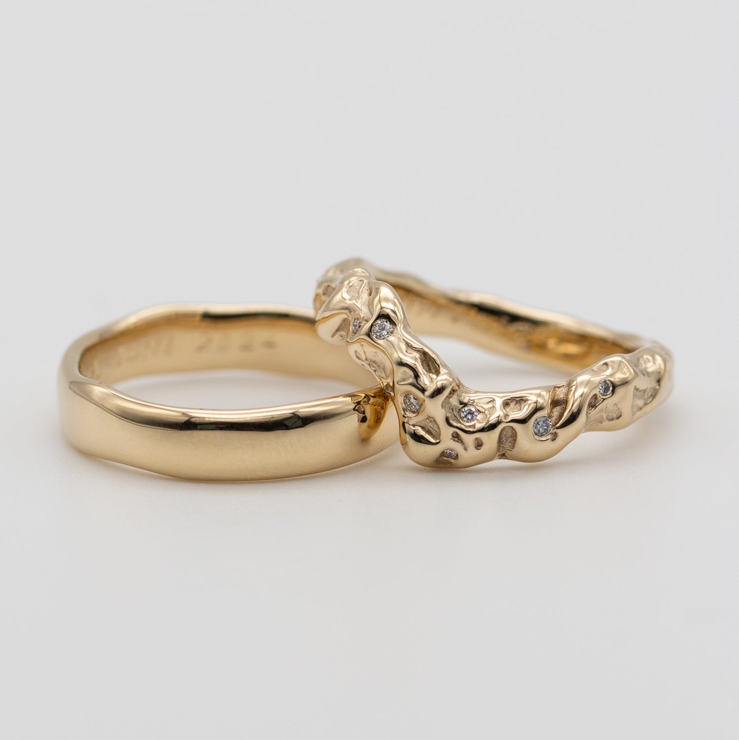 Unika-ringe i 14 eller 18 karat genanvendt guld, hvor vi i fællesskab designer jeres kommende vielsesringe. Se processen her - pris fra 22.000 kr. per sæt.