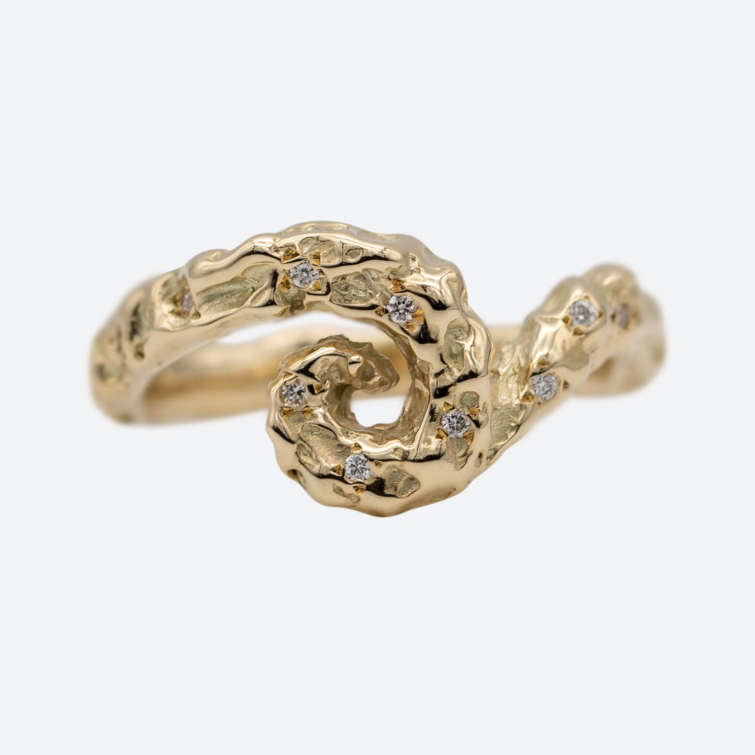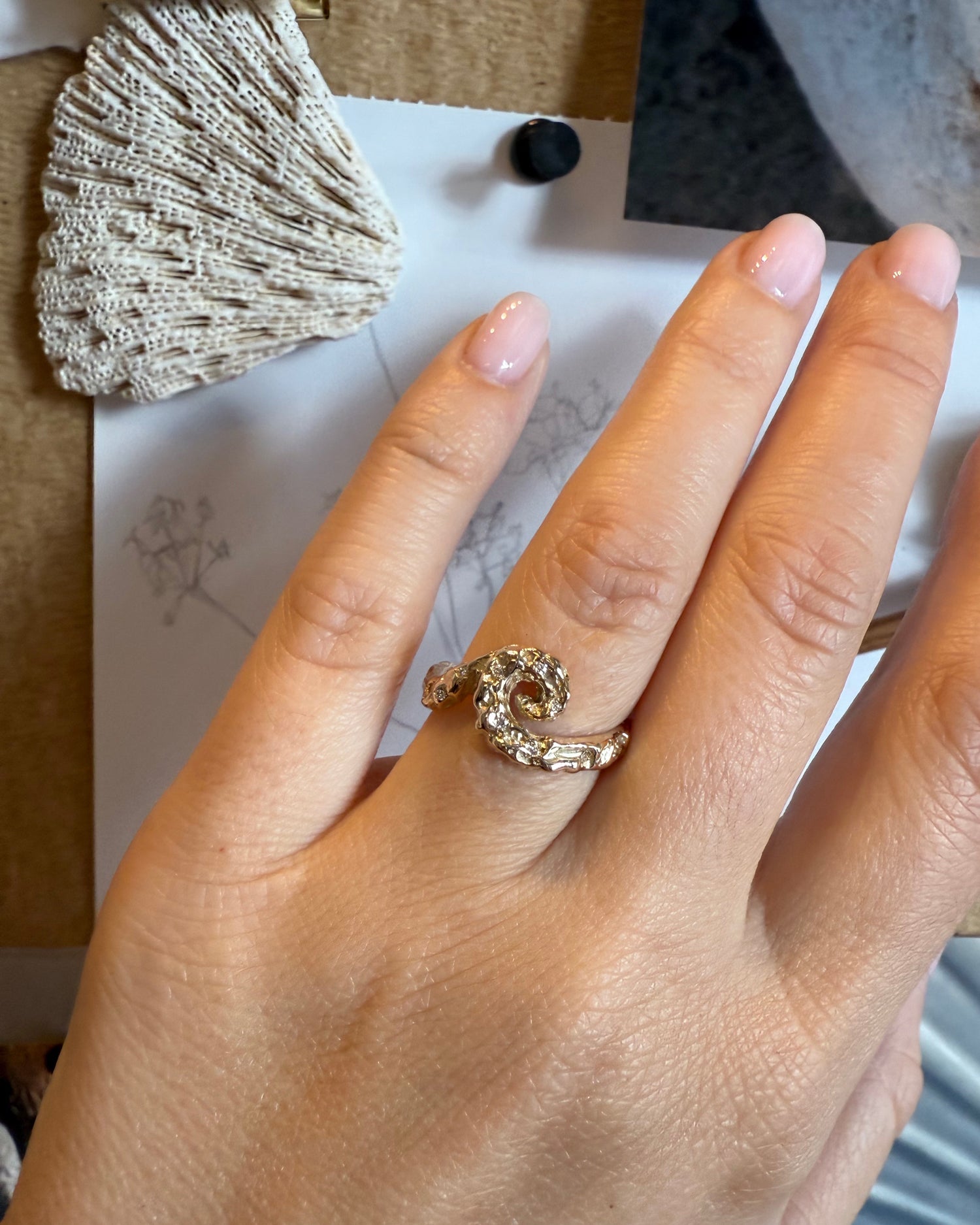 FIBO RING er en hyldest til naturens spiralformede mønstre – fra sneglehuse til hvirvlende bølger. Ringen bevæger sig dynamisk om fingeren med en levende tekstur, der forener det rå og det elegante. Små diamanter glimter langs spiralens kurver og tilfører et subtilt spil af lys. Designet i genanvendt 14 kt guld skaber en fornemmelse af bevægelse og tidløshed, inspireret af de matematiske former, der findes i naturen.