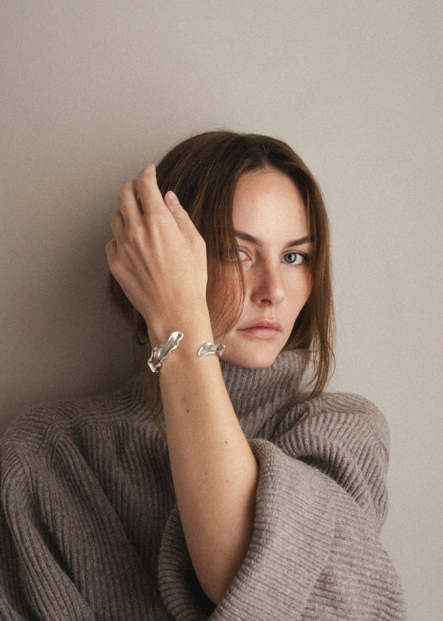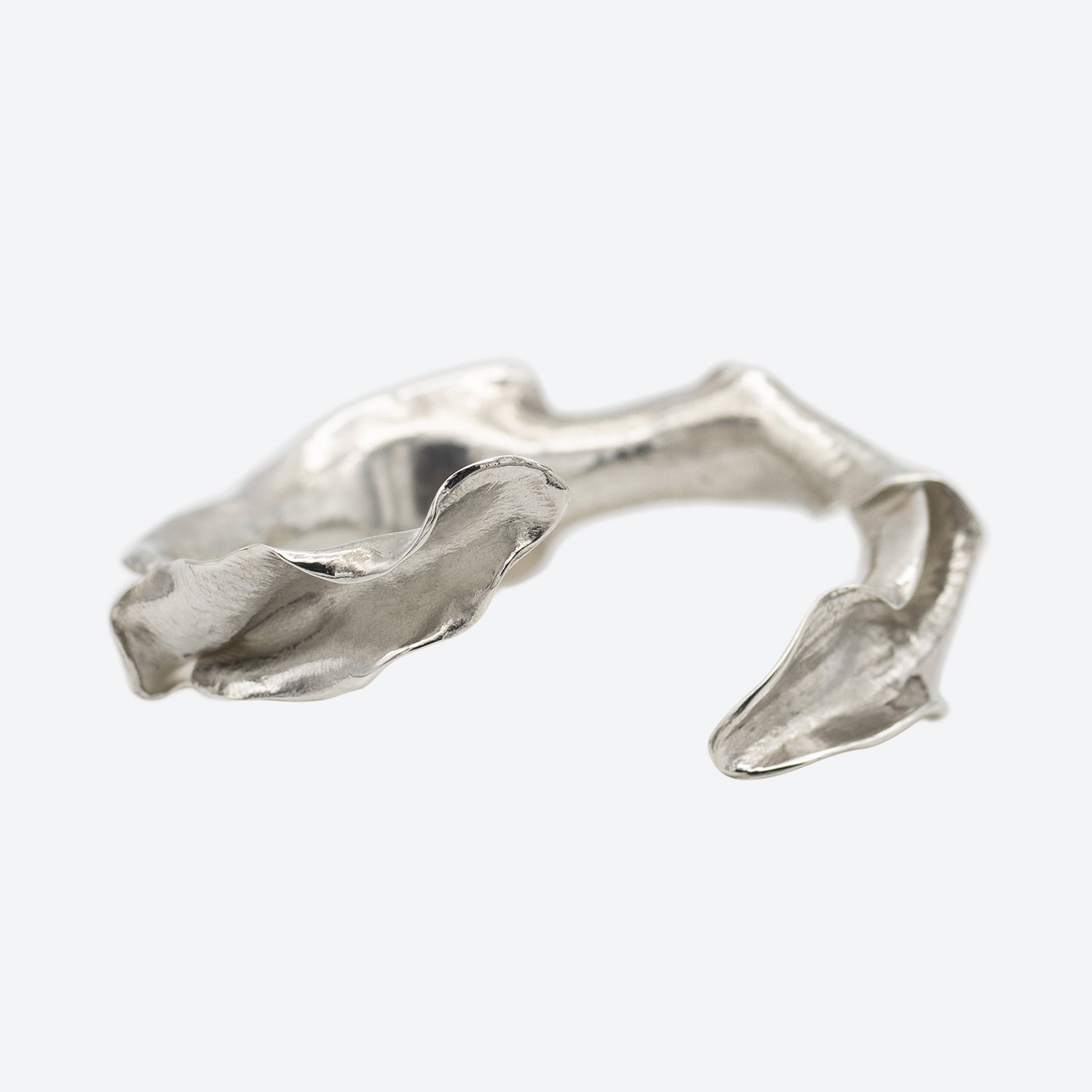 VALERIANA CUFF smyger sig om håndleddet som et langt blad. Inspirationen er hentet fra lægebaldrianens slanke blade, der danner en organisk silhuet. Den åbne form gør cuffen både skulpturel og komfortabel, mens sølvets forløb understreger de bløde linjer.
